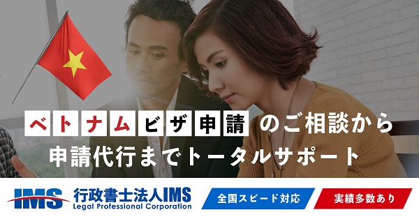 行政書士法人IMS所属の行政書士が担当窓口となり、現地の情報やビジネス状況を熟知したバイリンガルベトナム人と協力して、お客様のご不安、ご負担を軽減し満足度の高いサービスを提供することを目指しております。ベトナム現地のエージェントと言語の問題だけではなく、文化の違いによる業務の進め方の行き違いがあり、スムーズに申請が進まずお困りの方より多くご相談を受けます。