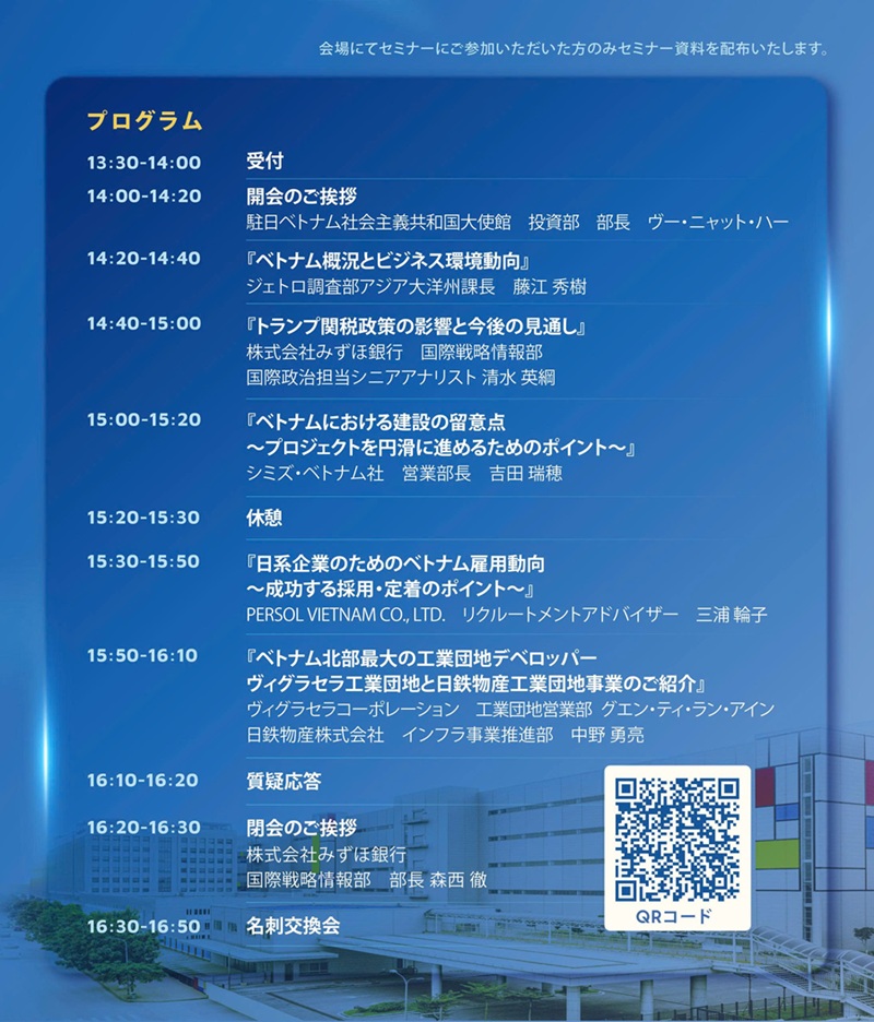 今回のセミナーには、清水建設、みずほ銀行、PERSOL Vietnamが共催し、工業団地のみならず、トランプ関税の影響、建築、雇用など多角的にベトナムの投資環境に関する情報を提供する。