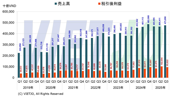 VN30インデックスを構成する主要上場企業30社の2025年7~9月財務諸表では、同期の売上高合計が前年同期を上回ったものの、前年10~12月のピークには届かなかった。一方、税引後利益合計は前期比でわずかに減少したものの、銀行や証券、エネルギー分野の好調により、本業の収益力は着実に改善した。金融を中心とした安定成長に加え、製造業や小売業にも回復の兆しが見え始めている。