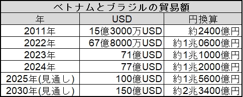 ブラジルは現在、ベトナムにとって中南米最大の貿易相手国となっている。両国の貿易額は2011年の15億3000万USD(約2400億円)から、2022年に67億8000万USD(約1兆0600億円)、2023年に71億USD(約1兆1000億円)、2024年には77億USD(約1兆2000億円)へと拡大した。両国は、貿易額を2025年に100億USD(約1兆5600億円)、2030年に150億USD(約2兆3400億円)へと引き上げることを目標としている。