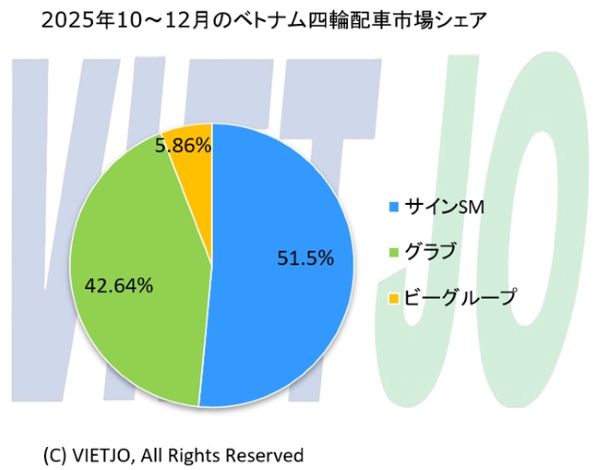 インドの調査会社モルドールインテリジェンス(Mordor Intelligence)が発表した2025年第4四半期(10~12月)におけるベトナム四輪配車市場のレポートによると、不動産開発を中核とする民間複合企業ビングループ[VIC](Vingroup)傘下のビンファスト(VinFast)製電気自動車(EV)・電動バイクのレンタカー・タクシー会社グリーン・スマート・モビリティ(GSM)の「サインSM」が初めてシェア50%を突破した。同社は15か月連続で首位を維持している。