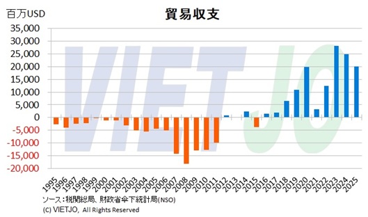 ベトナムの貿易収支は2016~2025年に10年連続の黒字となり、総合収支の重要な下支え要因となっている。2025年の黒字は200億USDと、輸出額の4.2%に相当し、この10年間で3番目の規模となった。