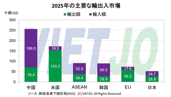 貿易パートナー別でみると、米国がベトナム最大の輸出先で、輸出額は1532億USDで、輸出総額の32.2%を占めた。一方、中国は最大の輸入元で、輸入額は1860億USDに達した。貿易収支は対米黒字1339億USD、欧州連合(EU)向け386億USD、日本向け21億USDとなる一方、中国に対しては▲1156億USD、韓国▲316億USD、東南アジア諸国連合(ASEAN)▲142億USDの赤字となった。