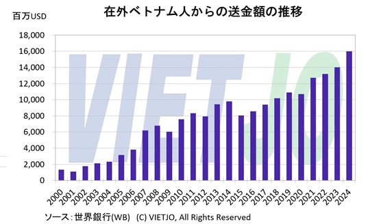 また、在外ベトナム人による本国送金も経常収支の安定要因となっている。送金額は2000~2024年にほぼ一貫して増加し、累計1913億USD、年平均77億USDと推計される。2024年は160億USDに達し、このうちホーチミン市向けが95億USDと約6割を占めた。2025年も同市向け送金は+8.3%増の103億USDと増加を続けた。