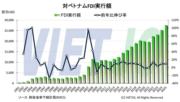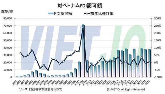 金融収支では、FDIが安定的な資金流入源となっている。2025年のFDI認可額は前年比+0.5%増の384億USD、実行額は同+9.0%増の276億USDとなり、直近5年間で最高水準に達した。