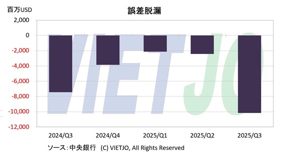 近年の対外収支で注目されるのが、「誤差脱漏」(統計で把握できない資金移動を示す項目)の拡大だ。2024年第3四半期(7~9月)から2025年第3四半期にかけて赤字が続き、2025年第3四半期には▲102億USDと、この期間で最大の赤字を記録した。