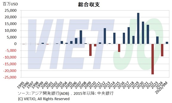 2016年から2021年にかけて、ベトナムの総合収支は黒字基調を維持し、2019年には233億USDの大幅黒字を計上した。しかし、2022年には米連邦準備制度理事会(FRB)による急速な利上げを背景とした世界的な金融引き締めを受け、新興国からの資金流出と対米資本回帰が進行し、総合収支は▲227億USDと過去最大の赤字に転落した。2023年は黒字に転じたものの、2024年は再び赤字となり、対外収支の不安定さが改めて浮き彫りとなった。2025年1~9月期は15億USDの黒字を確保したが、改善幅はなお限定的にとどまっている。