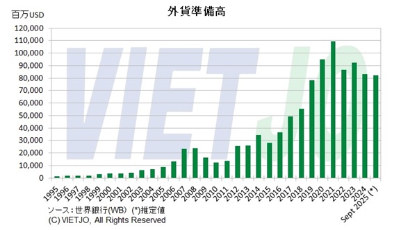 一方、2022年以降は世界的な金融引き締めと資本フローの変化を受け、外貨準備高は減少基調に転じた。中央銀行がVND安圧力に対応して為替介入を行った結果、2024年は831億USDまで減少した。2025年9月時点では822億USDと輸入額の2.2か月分にとどまり、2020年以降で最低水準となった。国際通貨基金(IMF)が目安とする「輸入額の3か月分」(2025年ベースで1138億USD)を下回る水準だ。