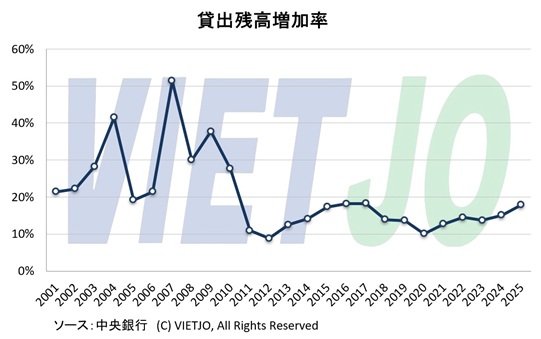 中央銀行によると、2025年末の貸出残高は前年末比+19.0%増の1京8580兆VND(約110兆円)となった。貸出拡大の主因は低金利環境の維持にあり、中央銀行は政策金利を据え置き、金融機関の調達コストを抑制しつつ、貸出金利を低水準に保つ方針を継続した。