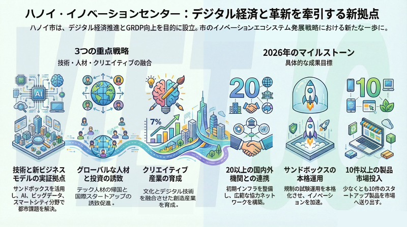 ハノイ市はこのほど、「ハノイ・イノベーションセンター株式会社(Ha Noi Innovation Center)」を設立した。市のイノベーションエコシステム発展戦略における新たな一歩と位置付けられ、データや資源、政策、技術を結ぶ中核拠点として、デジタル経済とデジタル社会の推進、域内総生産(GRDP)の質的な向上を担う。