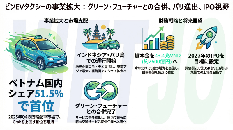 同社は急速に資本を増強しており、今年3回の増資を経て資本金を43兆4000億VND(約2600億円)へ引き上げた。これら一連の買収や増資は、2027年に企業評価額200億USD(約3兆1000億円)規模でのIPOを目指す戦略の一環とみられている。