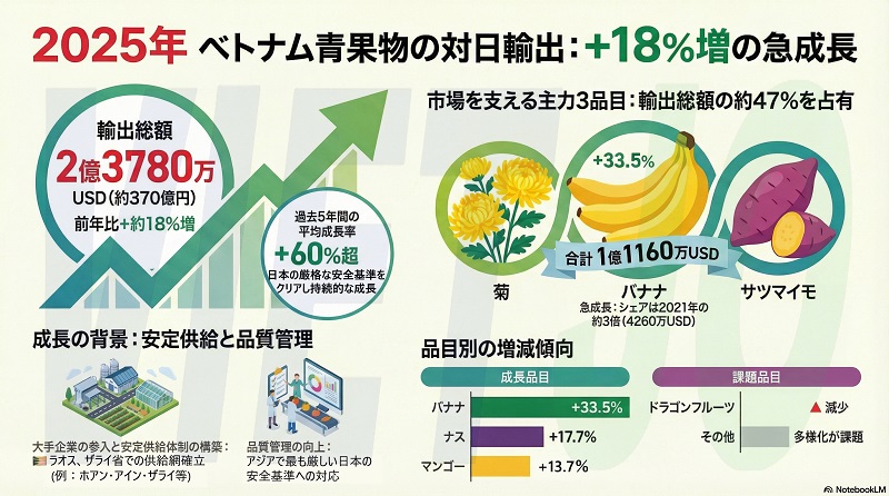 税関局の最新データによると、2025年の日本向け青果物輸出額は前年比+約18%増の2億3780万USD(約370億円)に達した。特にキク、バナナ、サツマイモの3品目が輸出額の半数近くを占め、市場を牽引している。