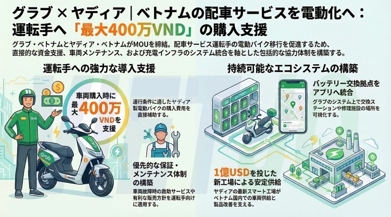 今回の提携の目玉となるのは、運転手に対する直接的な資金支援だ。運転手は、テクノロジーを活用した配車サービスの運行条件に適したヤディア製電動バイクを購入する際、1台あたり最大400万VND(約2万4000円)の支援を受けることができる。