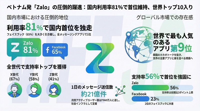 なお、ザロは地場総合インターネットメディア運営大手VNGコーポレーション[VNZ](VNG Corporation)が展開している。2025年12月末時点でザロの月間アクティブユーザー数は約7960万人、1日あたりの送信メッセージ数は約21億件となっており、圧倒的なユーザー基盤を誇っている。