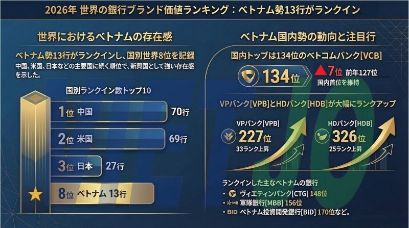 ベトナムからは13行がランクインし、国別のランクイン数で世界8位となった。今回、順位を大きく伸ばしたベトナムの銀行として、三井住友銀行が出資する大手民間銀行VPバンク[VPB](VPBank)が挙げられる。VPBは前年から+33ランク上昇の227位となり、国内勢で最大の上昇幅となった。クレディセゾン出資の金融子会社を持つ大手民間銀行HDバンク[HDB](HDBank)も+25ランク上昇の326位と大幅なランクアップとなった。