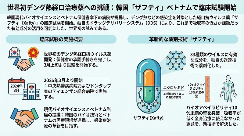 保健省傘下の中央熱帯病病院と韓国のバイオ企業である現代バイオサイエンス(Hyundai Bioscience)は5日、デング熱などの感染症を治療する抗ウイルス薬「ザフティ(Xafty)」の臨床試験を開始すると発表した。中央熱帯病病院と南部メコンデルタ地方ドンタップ省(旧ティエンザン省)のティエンザン総合病院で実施する。