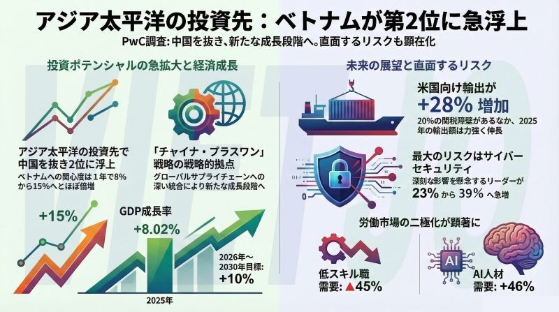 PwCベトナム(PwC Vietnam)のマイ・ベト・フン・チャン社長は、アジア太平洋地域が全体的に慎重な姿勢を示す中で、ベトナムは商業やサプライチェーン再構築における戦略的拠点として稀有な機会に恵まれているとの見方を示した。CEOから強い関心を集める背景には、経済の回復力と法整備の近代化がある。
