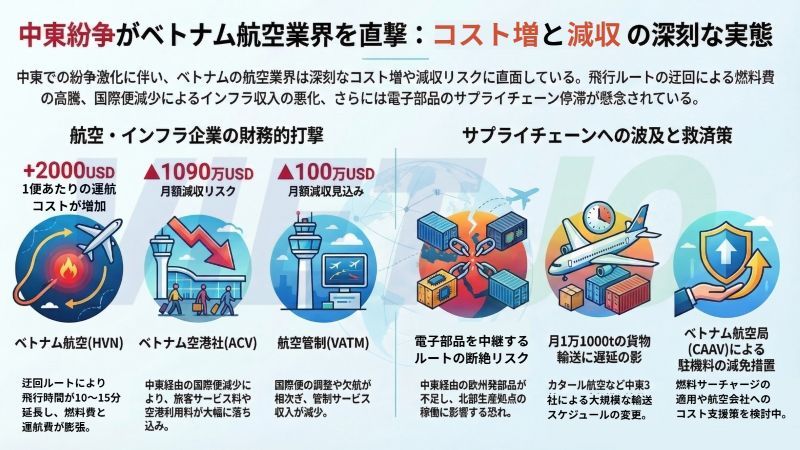 中東の紛争がベトナムの航空業界に深刻な影響を与えており、建設省傘下ベトナム航空局(CAAV)は各社が直面しているコスト増や減収リスクに関する評価レポートを発表した。飛行ルートの迂回による運航コストの増加や、国際便の減少に伴う空港および管制サービスの減収などが懸念されている。