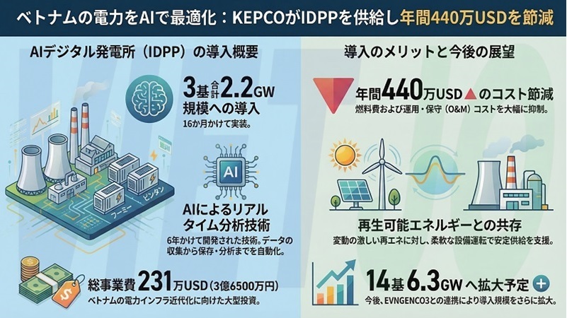 韓国電力公社(KEPCO)はこのほど、ベトナム電力グループ(EVN)傘下の大手発電会社である第3発電総公社[PGV](EVNGENCO3)に対し、人工知能(AI)を搭載したデジタル発電所プラットフォーム(IDPP)を供給する契約を締結した。