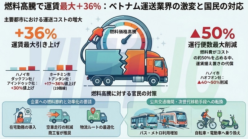 中東紛争の影響による国内のガソリン価格の持続的な上昇を受け、ベトナム国内の多くの輸送会社が運行コストの増加を補うため、運賃の値上げや便数の削減などの対応を迫られている。値上げ幅は最大で+36%に達している。