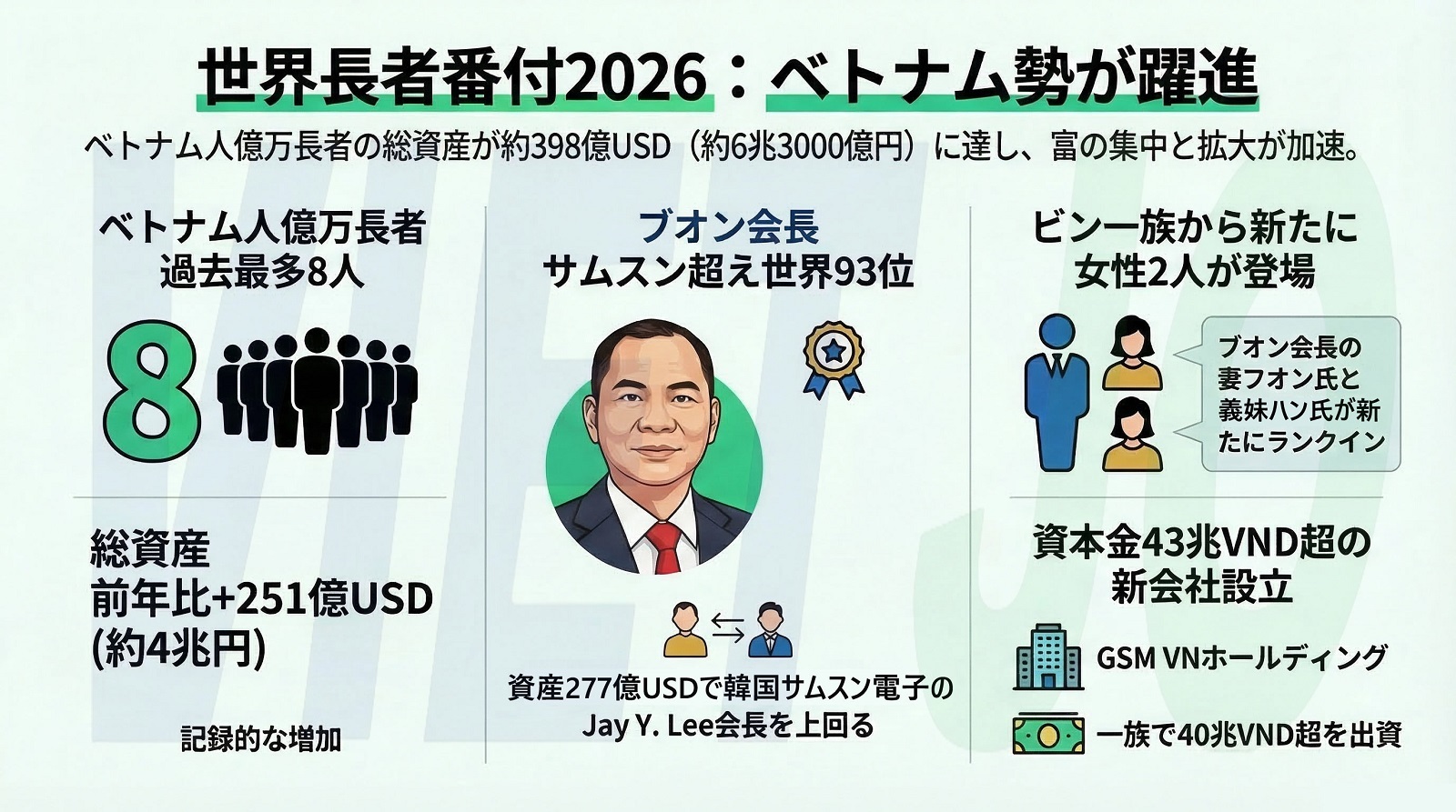 米経済誌フォーブス(Forbes)が発表した2026年版の世界長者番付に、ベトナムから過去最多となる8人の億万長者が名を連ねた。ベトナム人億万長者の総資産は約398億USD(約6兆3000億円)で、前年比+251億USD(約4兆円)増加した。