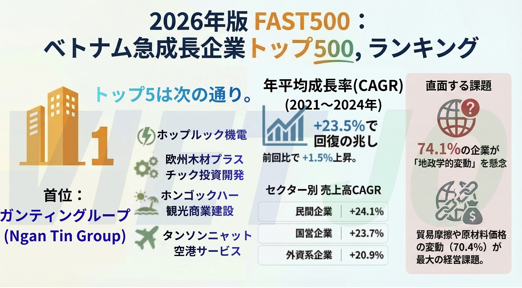 ベトナム評価レポート社(ベトナムレポート=Vietnam Report)とベトナムネット(Vietnamnet)はこのほど、ベトナム企業成長率トップ500社ランキング「FAST500」の2026年版を発表した。表彰式は4月にホーチミン市で開催される予定だ。