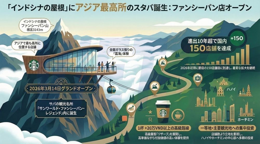 米コーヒーチェーン大手スターバックス(Starbucks)の現地法人スターバックス・ベトナム(Starbucks Vietnam)は14日、西北部地方ラオカイ省サパにあるファンシーパン山に新店舗「スターバックス・ファンシーパン店」をオープンした。同店舗は同ブランドにとって、アジアで最も高所に位置する店舗となる。