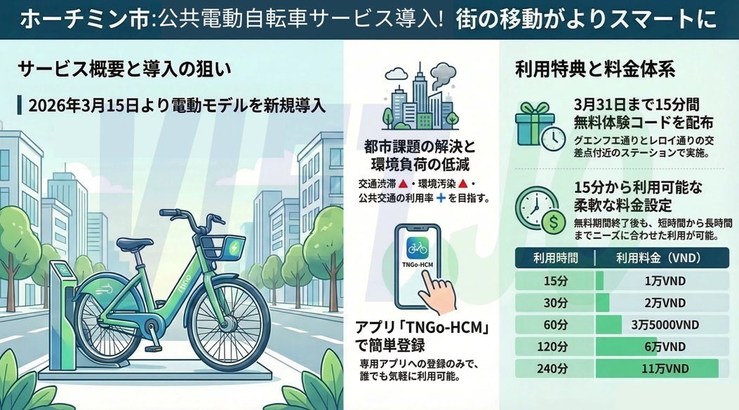 ホーチミン市で3月15日、既存の公共自転車シェアリングサービスに加えて、公共電動自転車サービスが新たに導入された。3月31日までの期間、市民や観光客は15分間の無料体験を利用できる。