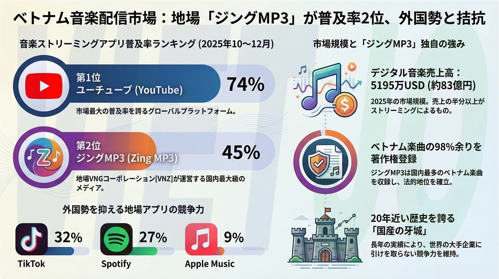 地場市場コンサルタント会社デシジョンラボ(Decision Lab)が発表した2025年10~12月の音楽ストリーミングアプリに関するレポート「ザ・コネクテッド・コンシューマー(The Connected Consumer)」によると、地場総合インターネットメディア運営大手VNGコーポレーション[VNZ](VNG Corporation)の「ジングMP3(Zing MP3)」が、普及率ランキングの2位に入った。ジングMP3の普及率は45%となっている。