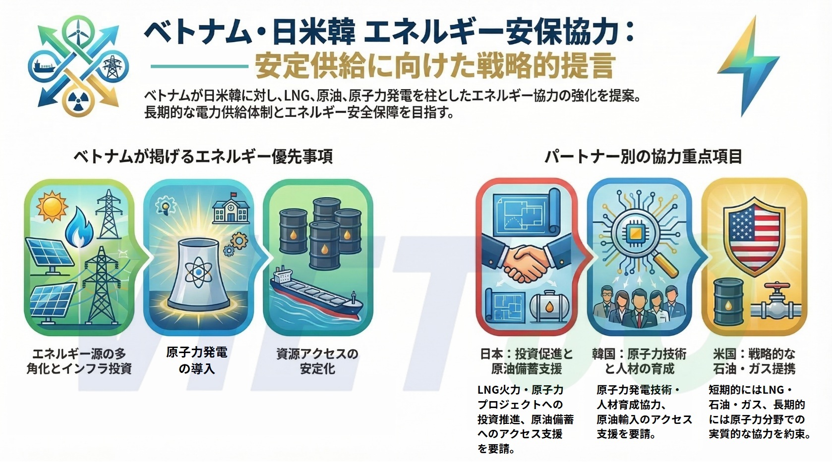ロン商工次官は出張の枠組みの中で、日本、米国、韓国の代表者らと二国間協議を行った。14日午後に行われた日本の経済産業省の松尾剛彦経済産業審議官との会談では、LNG火力発電や原子力発電など日本がベトナムで投資するエネルギープロジェクトの推進、そして長期的な協力方針について意見を交換した。また、豊富な原油備蓄を持つ日本に対し、ベトナムの国内需要を満たすための原油の探索とアクセス支援を求めた。