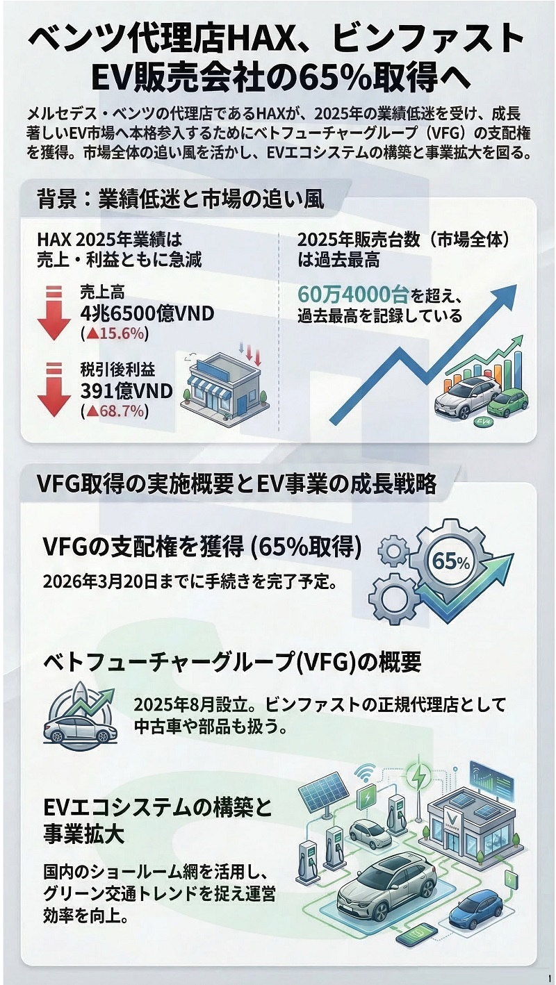 メルセデス・ベンツ販売ディーラーのハンサイン自動車サービス[HAX](Haxaco)の取締役会は、不動産開発を中核とする民間複合企業ビングループ[VIC](Vingroup)傘下の電気自動車(EV)メーカーであるビンファスト(Vinfast)製EVの販売を手掛けるベトフューチャーグループ(Viet Future Group=VFG)の株式65%を取得する計画を承認する決議を採択した。