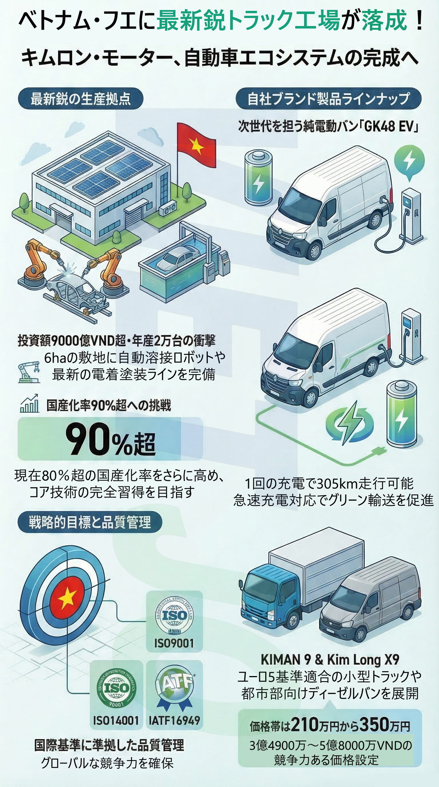 全生産工程においてISO 9001(品質マネジメント)、ISO 14001(環境マネジメント)、IATF 16949(自動車産業向け品質マネジメント)などの国際基準を満たしている。年産能力は約2万台規模となり、国内市場の需要に応えるとともに、地域諸国への輸出も視野に入れている。
