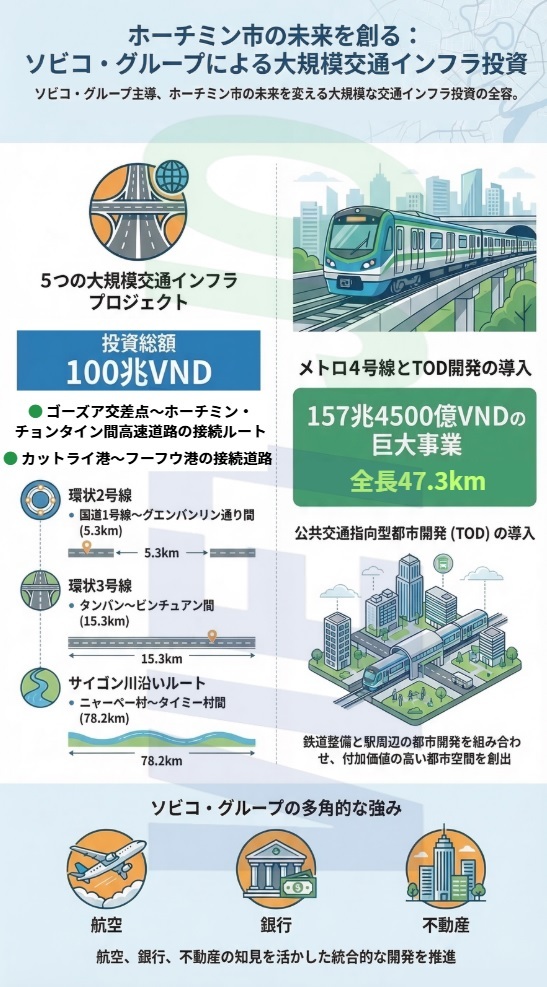 また、ソビコ・グループは以前提案していたホーチミン市都市鉄道(メトロ)4号線(ドンタイン村〜ヒエップフオック都市区間)(旧ホックモン郡~旧ニャーベー郡間)についても、PPP方式(BT契約)での投資と公共交通指向型都市開発(Transit-Oriented Development=TOD)を組み合わせた開発を提案している。路線の全長は47.3km(地下25.6km、高架21.7km)、投資総額は約157兆4500億VND(約9500億円)に上る。