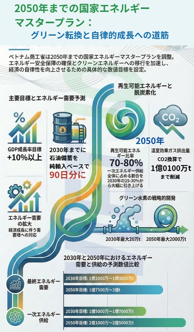 天然ガス生産量は、2026~2030年に年間54億~110億m3、2031~2035年に年間90億~150億m3、2036~2050年に年間140億~188億m3と予測している。さらに、液化天然ガス(LNG)の輸入能力を十分に開発し、各地域に適したLNGエネルギーセンターを形成する。