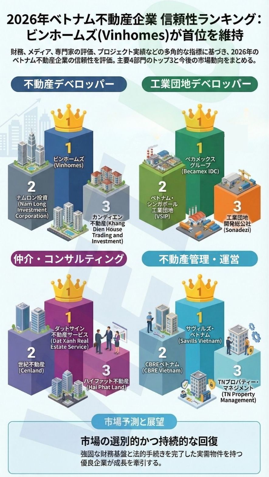 ベトナム評価レポート社(ベトナムレポート=Vietnam Report)は、2026年における信頼性の高い不動産デベロッパートップ10、工業団地不動産デベロッパートップ10、不動産コンサルティング・仲介会社トップ5、不動産管理・運営会社トップ5をそれぞれ発表した。