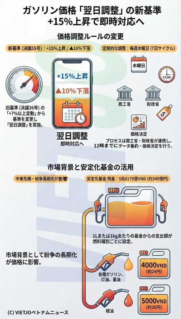 新たな規定によると、ベース価格が直近の改定時のベース価格と比較して+15%以上上昇した場合、商工省および財政省は翌日に直ちに価格調整を行う。また、ベース価格が▲10%以上下落した場合も同様に翌日に価格を調整する。これまでは、決議第36号/NQ-CPの規定により、ベース価格の変動幅が+7%以上となった場合に調整されていた。