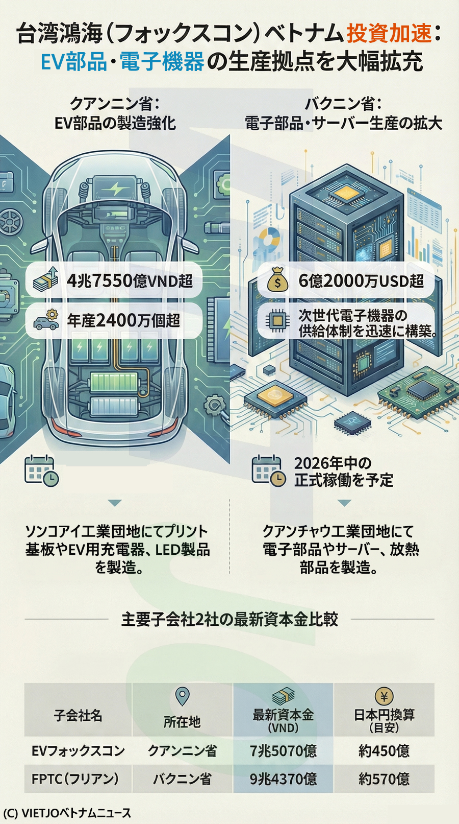 フォックスコンのベトナム子会社であるフリアン・プレシジョン・テクノロジー・コンポーネント(Fulian Precision Technology Component=FPTC)も最近、資本金を9兆4370億VND(約570億円)へと大幅に引き上げた。2026年1~2月期だけで、フォックスコンは同社に対し+1兆VND(約60億円)近くを追加投資している。