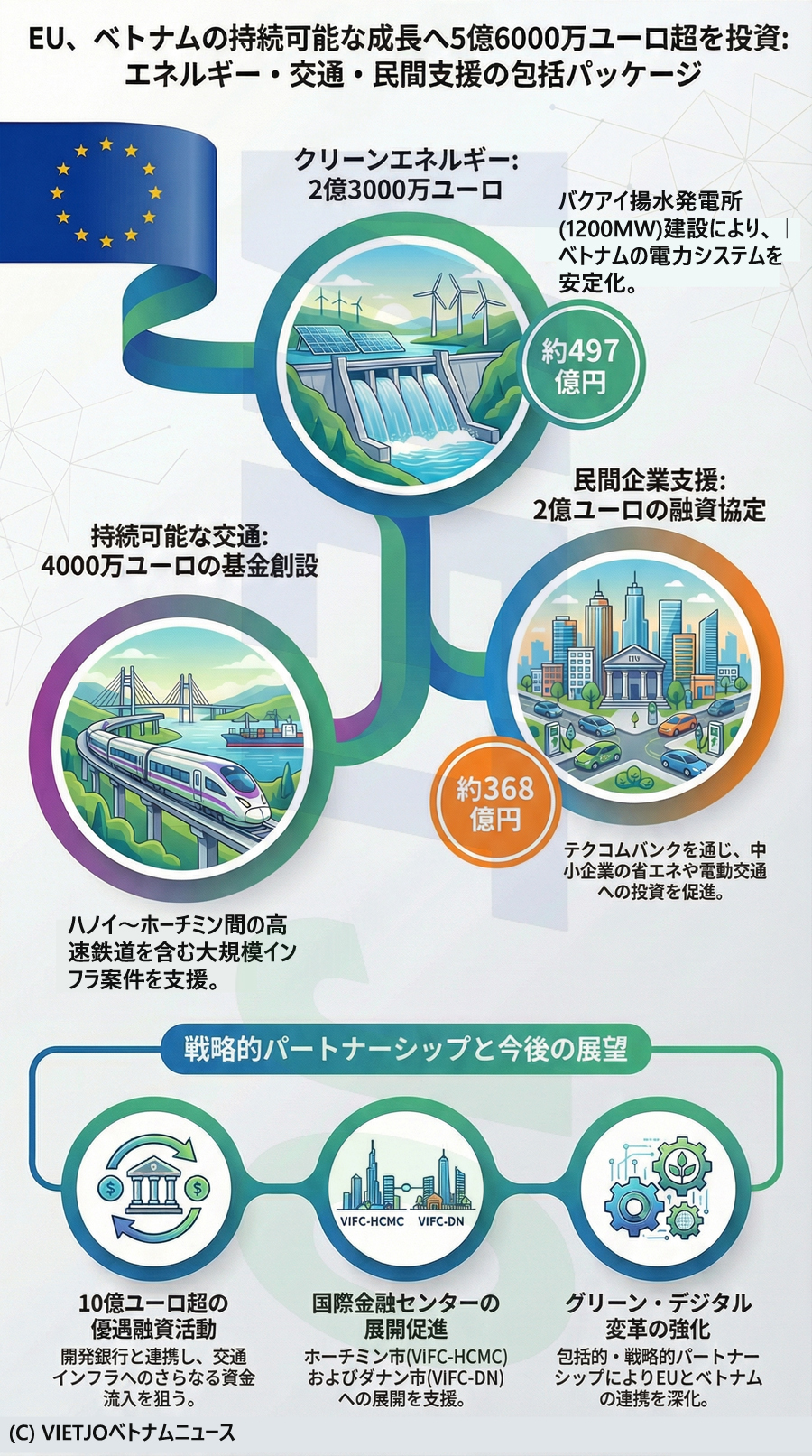 交通分野では、EUが4000万EUR(約74億円)規模の「持続可能な交通開発基金」を創設する。同基金は、ハノイ〜ホーチミン間の高速鉄道を含む鉄道、内陸水路、都市交通に焦点を当てた少なくとも4つの大規模公共インフラプロジェクトに対し、欧州の専門知識や技術を提供する。さらに、欧州の開発銀行から10億EUR(約1840億円)超の優遇融資を動員することを目指している。