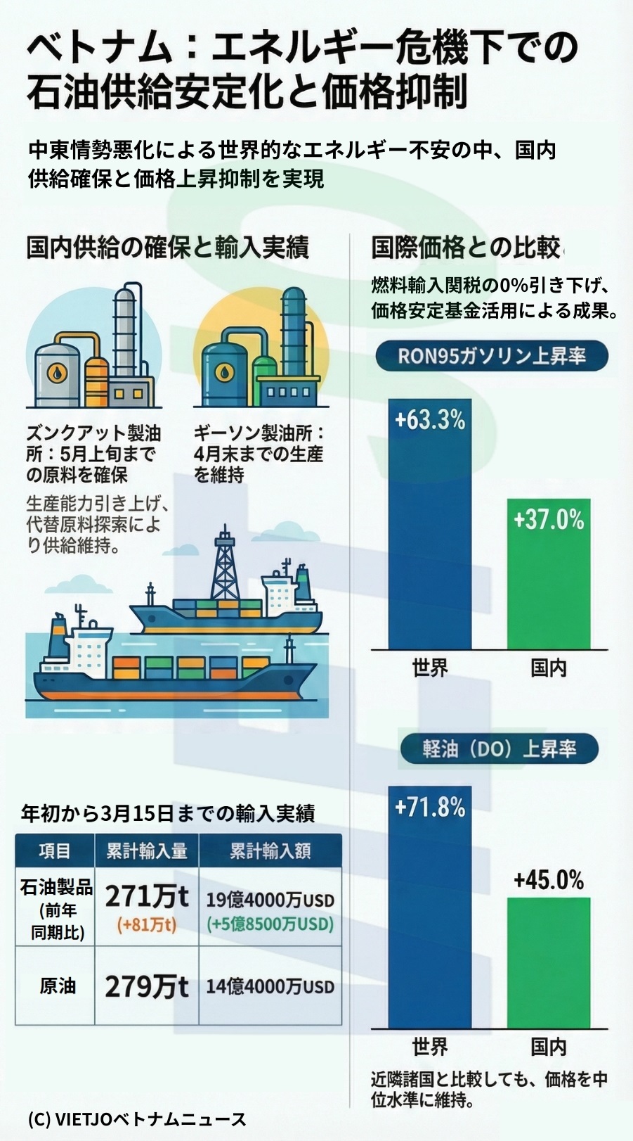 これにより、年初から3月15日までの累計では、石油製品の輸入量が前年同期比+81万t増の271万t、輸入額が同+5億8500万USD(約930億円)増の19億4000万USD(約3080億円)となった。