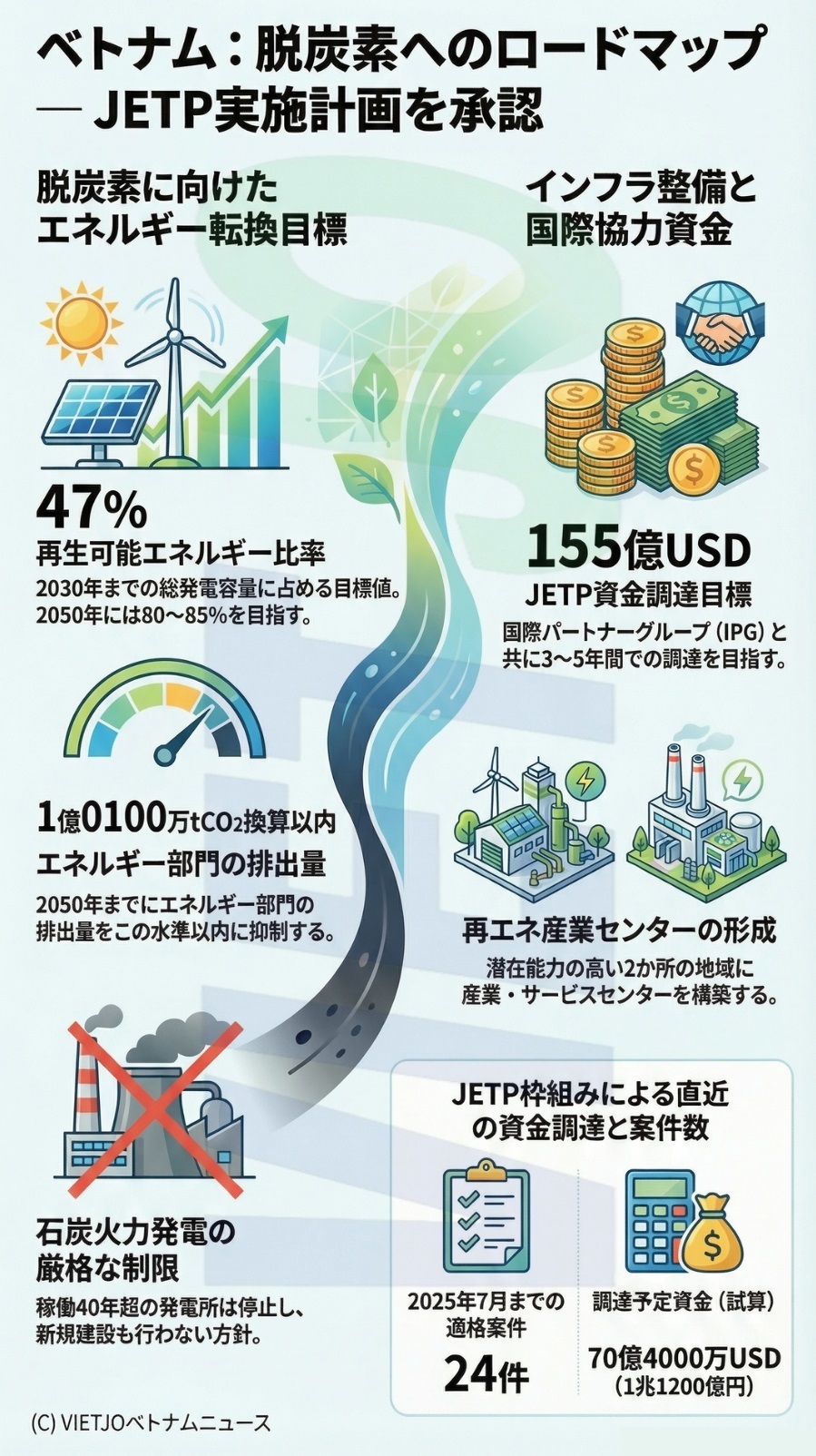2025年7月までに適格とされる案件は24件に上り、調達予定資金は総額70億4000万USD(約1兆1200億円)と試算されている。2023年に発表されたJETP資金調達計画によると、ベトナムとIPGは3~5年間で総額155億USD(約2兆4600億円)の調達を目指すという。