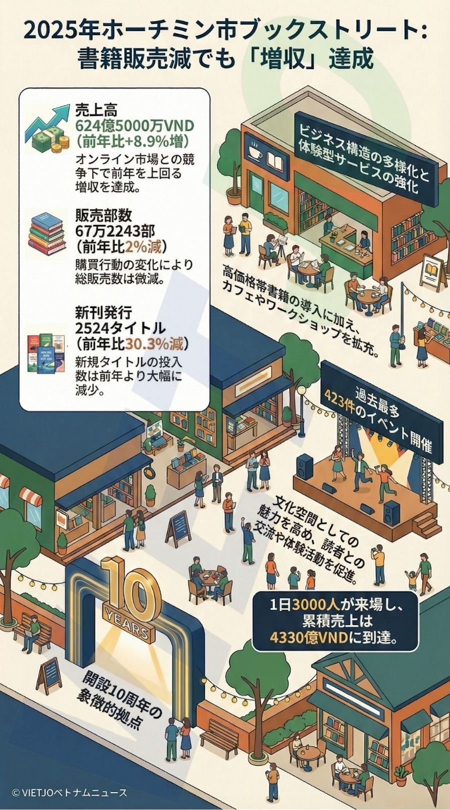 なお、ホーチミン市ベンゲー街区(旧1区)グエンバンビン(Nguyen Van Binh)通りにあるブックストリートは、2016年1月9日の開設から10周年を迎えた。1日当たりの来場者は約3000人に上り、このうち外国人観光客が30%を占めるなど、市の象徴的な文化拠点として定着している。10年間の累積売上高は4330億VND(約26億円)に達した。