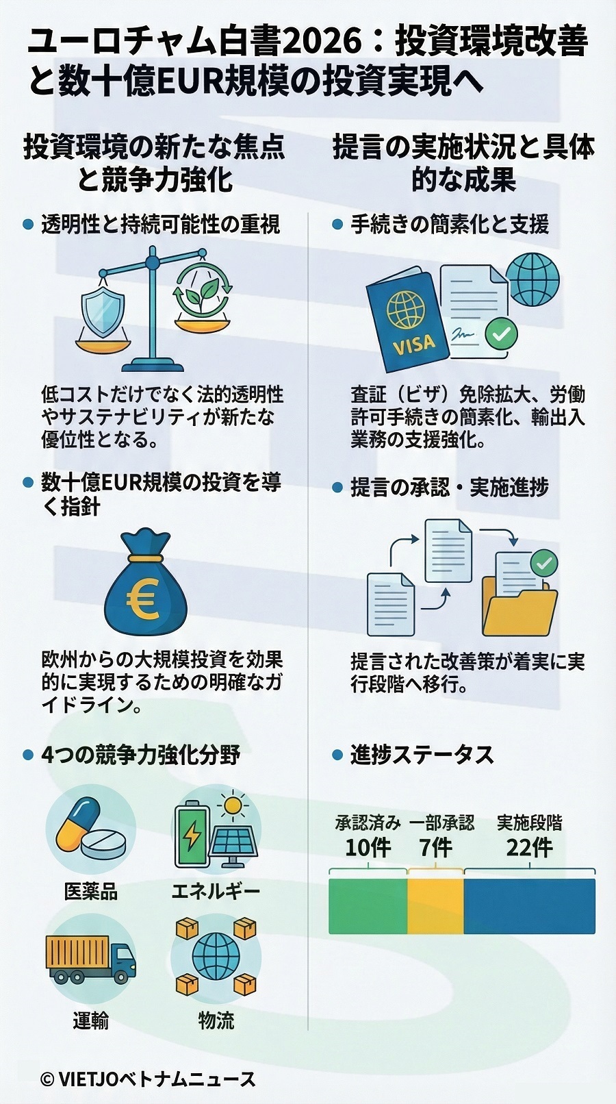 ジャスパート氏は、ベトナムの優位性はもはや低コストというだけでなく、法的枠組みの透明性やガバナンスの効率性、サステナビリティ基準に左右されるようになっていると指摘した。また、「白書は、数十億EUR(10億EUR=約1840億円)規模の投資公約を効果的に実現するための指針としての役割を担っている」と強調した。