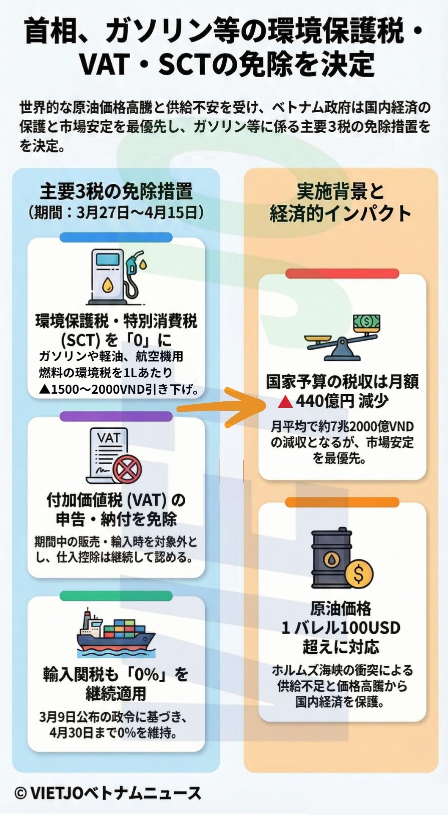 政府はこれに先立つ3月9日にも、供給逼迫リスクに対応するため、ガソリンや石油などの輸入関税を0%に引き下げる政令第72号/2026/ND-CPを公布しており、4月30日まで適用している。