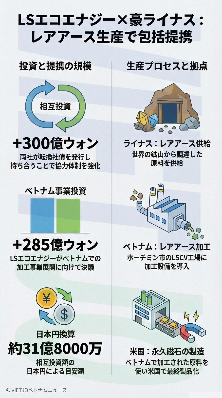 世界の鉱山会社からレアアースの供給を受けて加工し、永久磁石を製造する。加工はベトナム、永久磁石の製造は米国で行う。ベトナムにおいては、LSエコエナジーが子会社を設立して加工に当たる。両社はレアアースの調達から永久磁石の製造に至る協力体制を構築して徐々に事業規模を広げ、世界でのシェアを拡大していきたい考えだ。