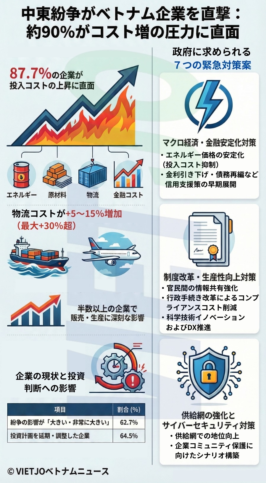 投資心理や資金調達環境の悪化も進んでおり、64.5%の企業が投資計画の延期や調整を余儀なくされている。多くの中小企業はコスト、物流、受注、資金に関する同時多発的な外部ショックへの対応能力が限られており、厳しい状況に立たされている。これを受け、IV委員会は企業や専門家の意見を取りまとめ、首相に7つの解決策を提案した。