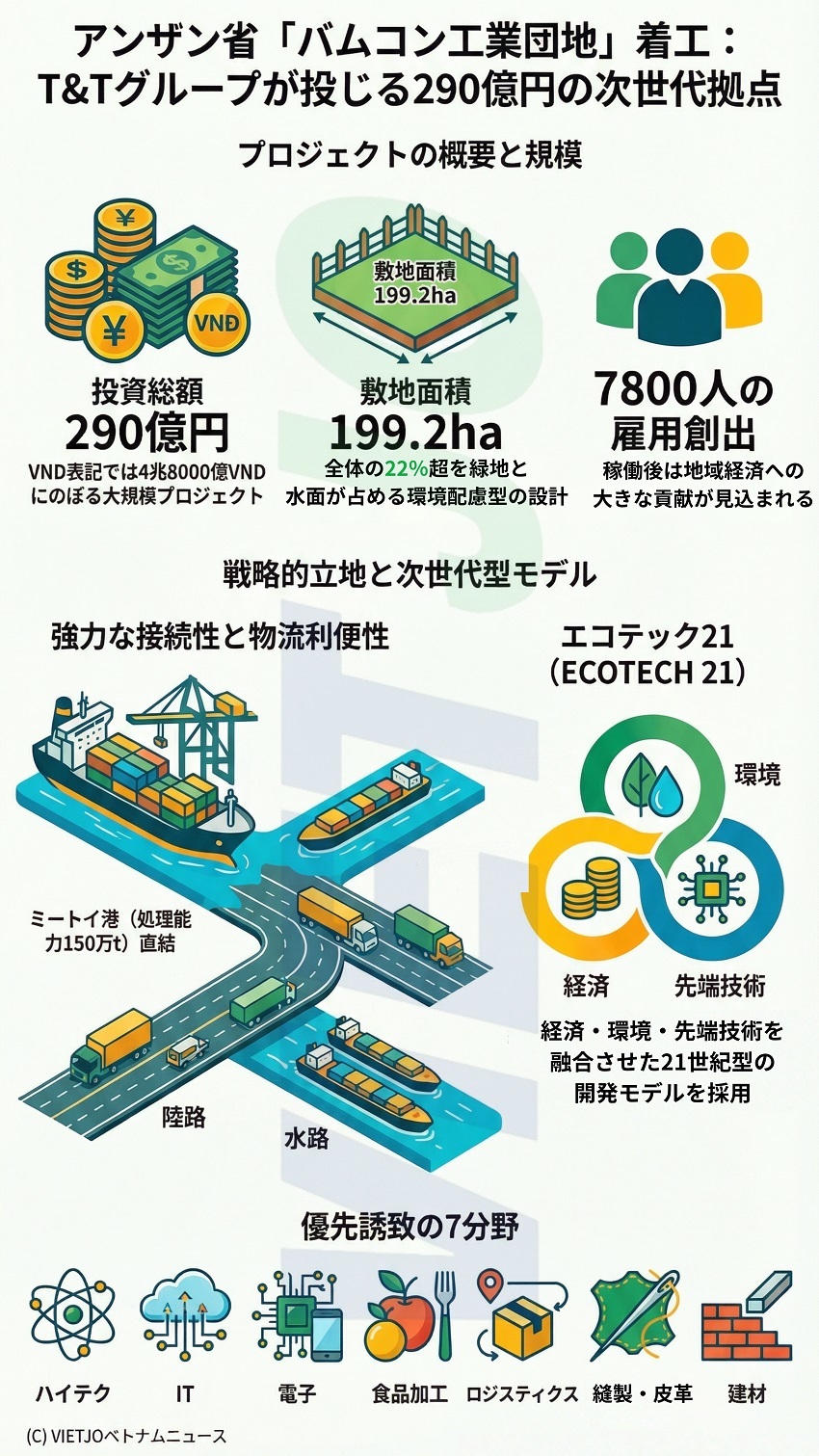 地場系コングロマリット(複合企業)T&Tグループ(T&T Group)と南部メコンデルタ地方アンザン省人民委員会は3月30日、同省ミートイ街区でバムコン工業団地のインフラ開発投資プロジェクトの着工式を共催した。投資総額は4兆8000億VND(約290億円)となる。