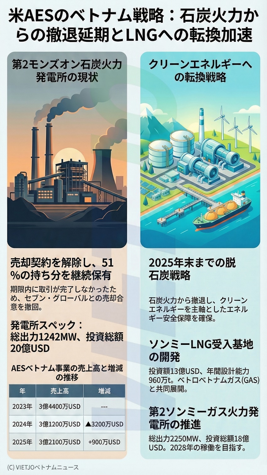 AESの2025年のベトナムでの売上高は約3億2100万USD(約510億円)で、2024年の3億1200万USD(約500億円)からほぼ横ばい、2023年の3億4400万USD(約550億円)からはわずかに減少したものの、安定した事業活動を維持している。