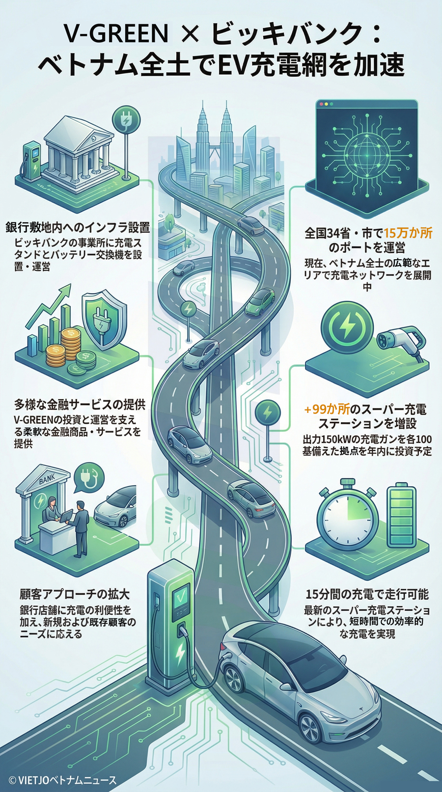 不動産開発を中核とする民間複合企業ビングループ[VIC](Vingroup)傘下の電気自動車(EV)メーカーであるビンファスト(VinFast)のEV充電インフラ整備を手掛けるV-GREENグローバル充電スタンド開発会社(V-GREEN)と、新世代のデジタルバンクであるビッキデジタル銀行(ビッキバンク=Vikki Bank)は1日、充電ステーションとバッテリー交換キャビネットのインフラ開発に関する戦略的提携を発表した。