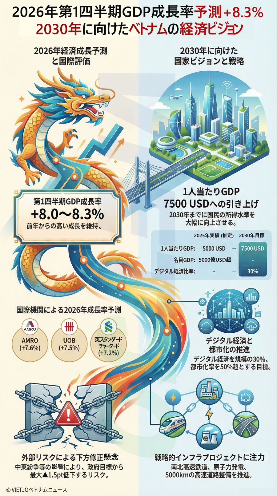 2025年のベトナムのGDP成長率は推定で前年比+8.02%となり、国会目標の+8.0%以上を達成した。名目GDPは初めて5000億USD(約80兆円)を超え、1人当たりGDPも5000USD(約80万円)を突破している。