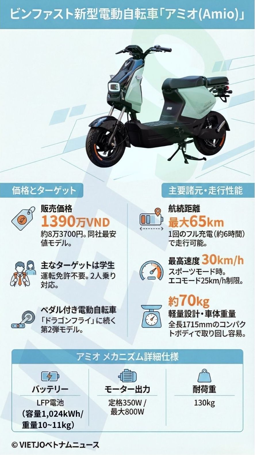 販売価格は1390万VND(約8万3700円)と、同社の製品ラインナップの中で最も安価に設定されており、運転免許を持たない学生を主なターゲットとしている。アミオはペダルを備えたモペットタイプの車両で、同社にとって「ドラゴンフライ(DrgnFly)」に次ぐ2番目の電動自転車モデルとなる。